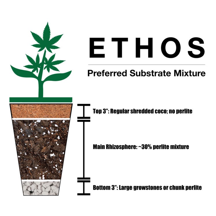 I use a more aerated coco perlite mixture for the bulk of the rhizosphere. For the top 3” of the container, I use just regular shredded coco, no perlite.